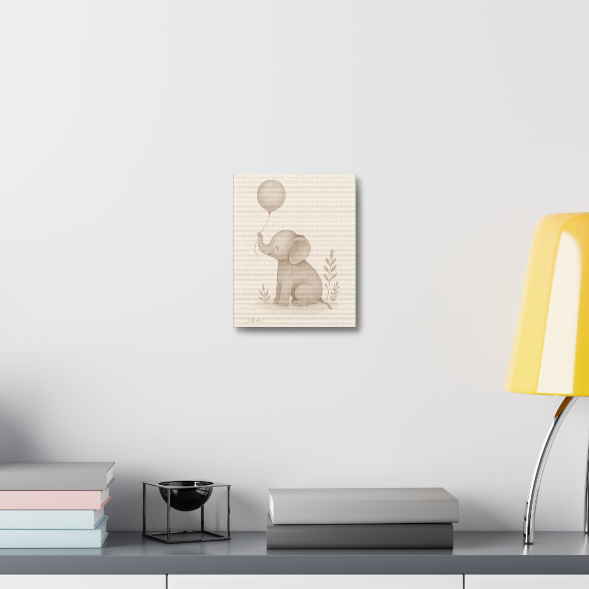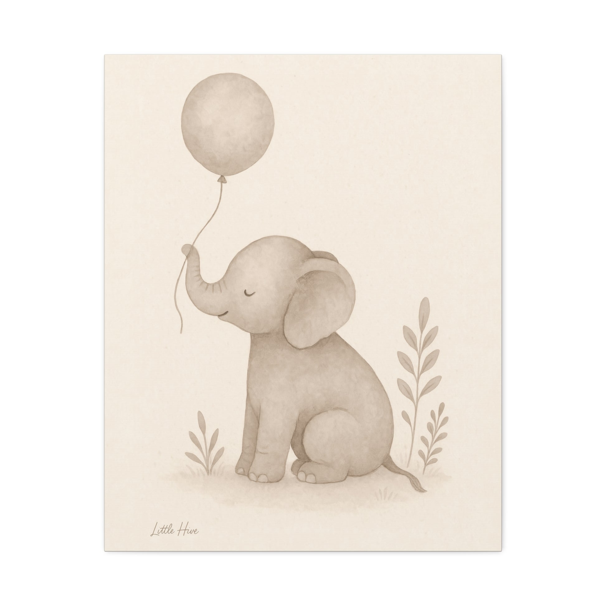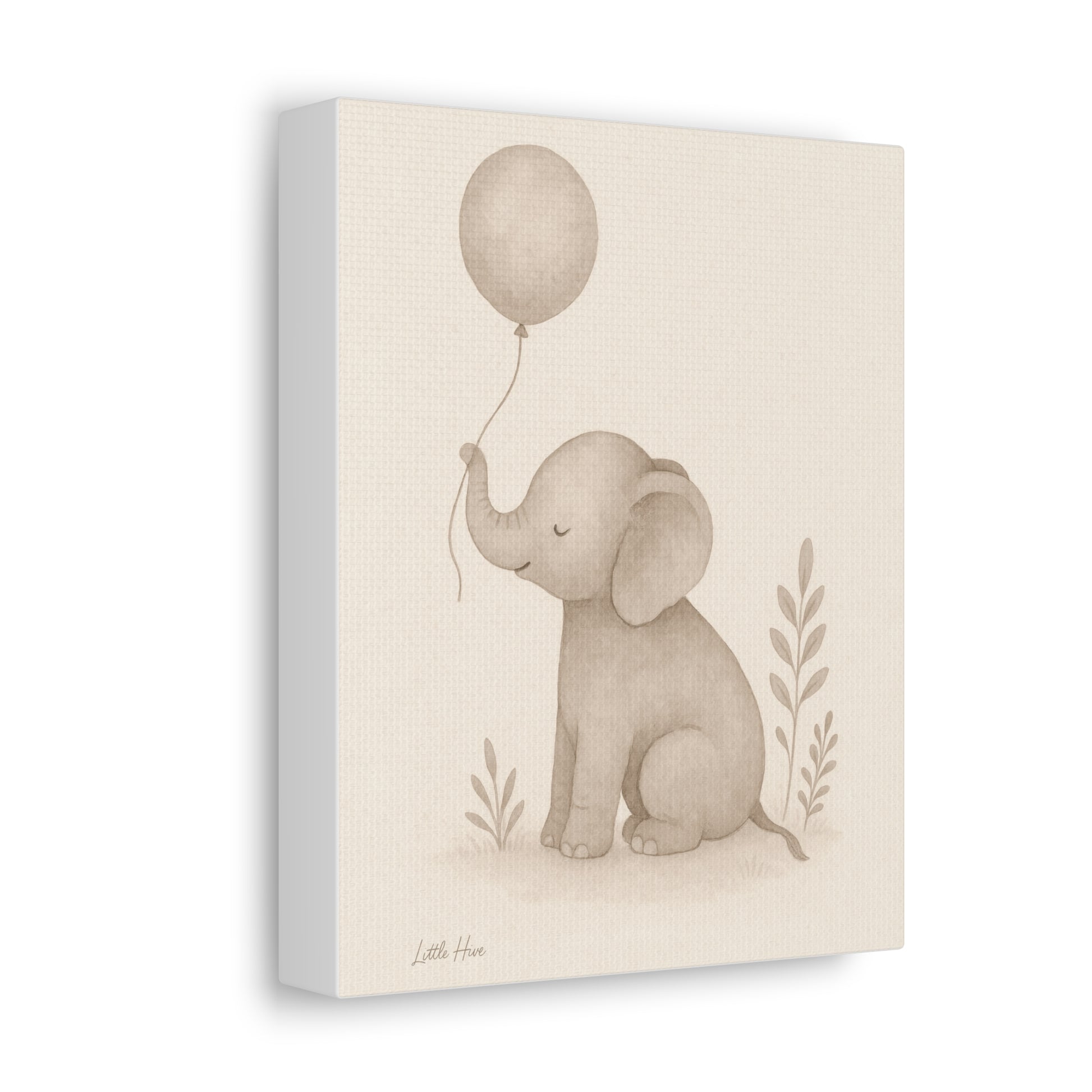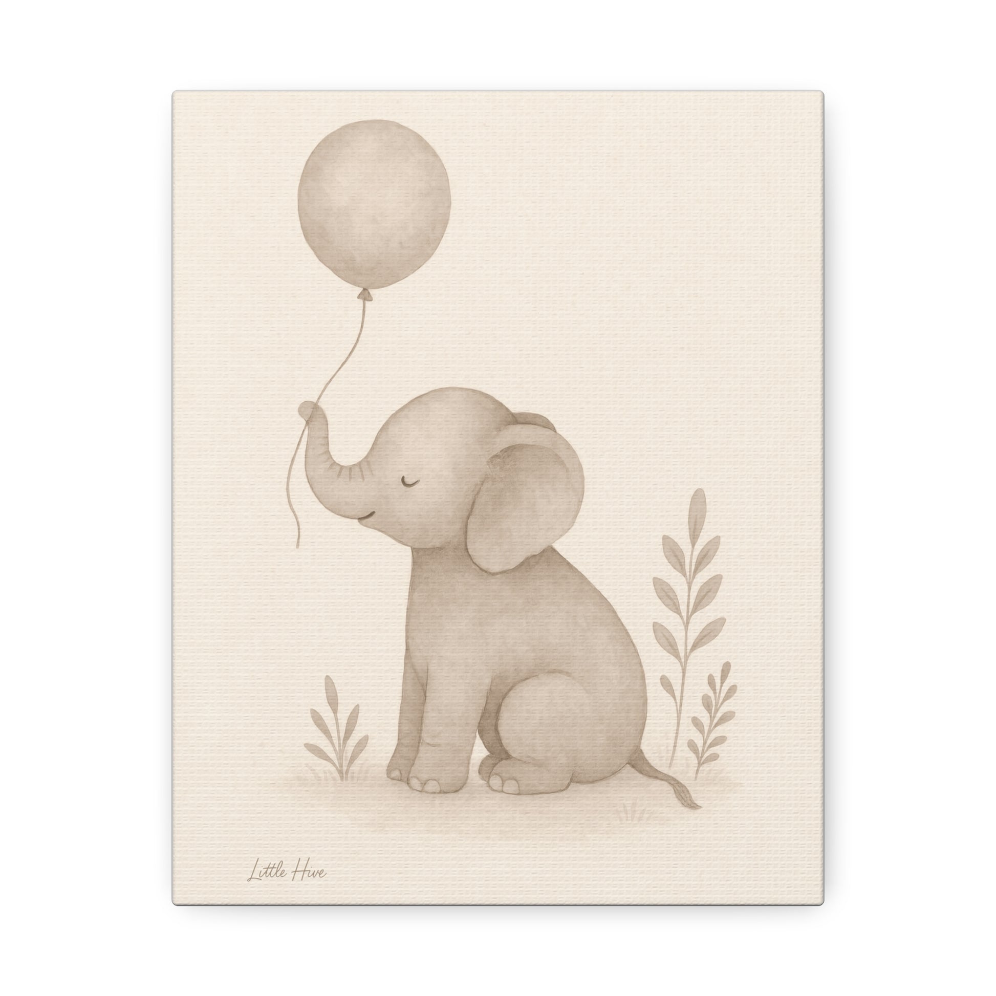 Baby Elephant Holding a Balloon — Nursery Stretched Canvas (Neutral Baby Room Wall Art)