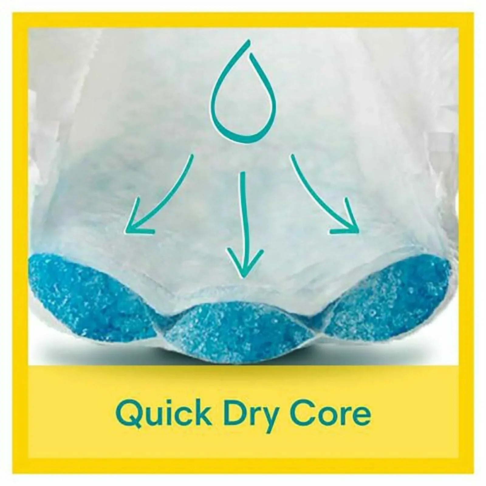 Détails : Testé dermatologiquement et sans allergènes de parfum de l’UE. Protection anti-fuites jusqu’à 100 % grâce à un système unique de triple protection qui absorbe rapidement le liquide et aide à prévenir les fuites à la taille et autour des jambes. Matières ultra-douces sélectionnées pour le plus grand confort de la peau de bébé.