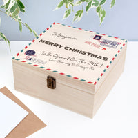 Pour un cadeau magnifique qui fera plaisir à coup sûr à Noël, offrez à votre enfant une boîte de Noël personnalisée façon courrier international nostalgique. Elle est conçue comme le recto d'une lettre internationale traditionnelle, timbre compris, avec une jolie bordure rouge et bleue et un message au centre, façon carte de Noël.