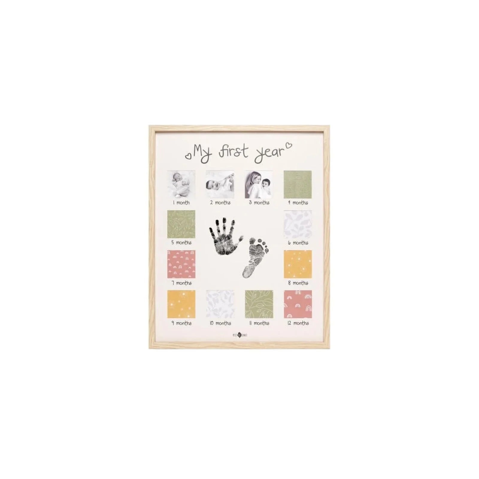 Ce cadre, avec ses 12 fenêtres, vous permet de mettre en valeur les photos de chaque mois de la première année de votre bébé. L'espace central est dédié aux empreintes de mains ou de pieds sans encre. Entièrement personnalisable, il vous permet de créer un souvenir unique, retraçant chronologiquement le développement de votre enfant. Grâce à la technologie « Smart Inkless Touch », vous obtenez des empreintes réalistes et détaillées sans aucun contact d'encre avec la peau de votre bébé. Son design recto-verso (anglais/français) et son fond à motif Petit Artichaut apportent une touche d'élégance, même en attendant les photos des mois suivants. Ce cadre exceptionnel rassemble tous les souvenirs de la première année dans un seul cadre, offrant un résumé parfait de la croissance de votre bébé.