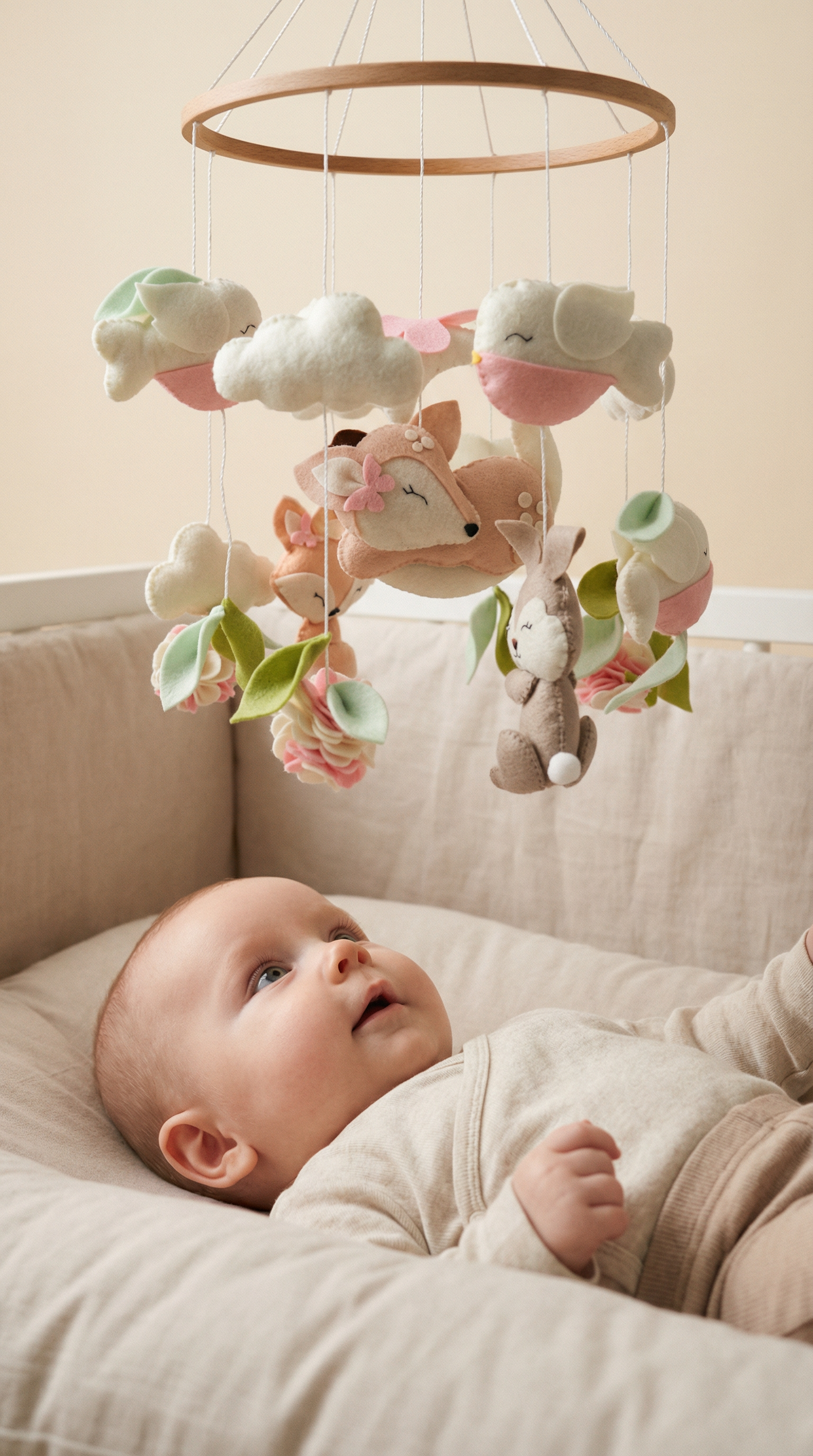 Ce mobile représente un faon paisiblement endormi, un lapin tout doux, un renard espiègle et de jolis oiseaux nichés parmi des fleurs, des nuages et des feuillages en feutrine. Chaque élément est soigneusement agencé pour créer une scène forestière aérienne qui ondule subtilement au gré du vent, apportant une touche de douceur à la décoration de la chambre de votre enfant.