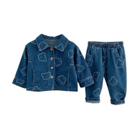 A cotton-rich denim set featuring an all-over bear print in a soft washed finish. This two-piece outfit includes a button-front denim jacket with a turn-down collar and matching jogger-style trousers with an elasticated waistband. Designed in a relaxed casual fit for everyday wear.