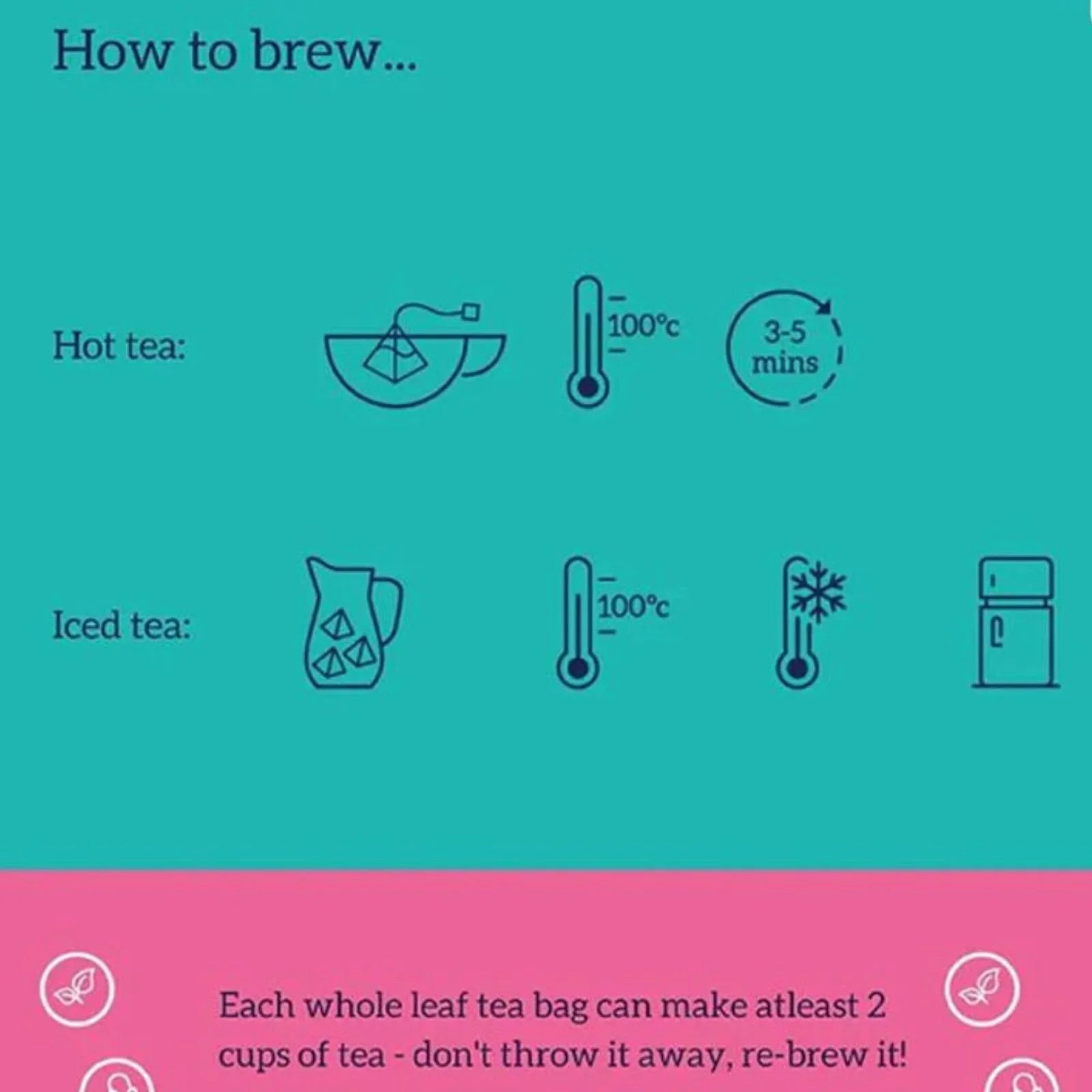 • Each tea bag makes two cups. Strong flavour allows for re-brewing.