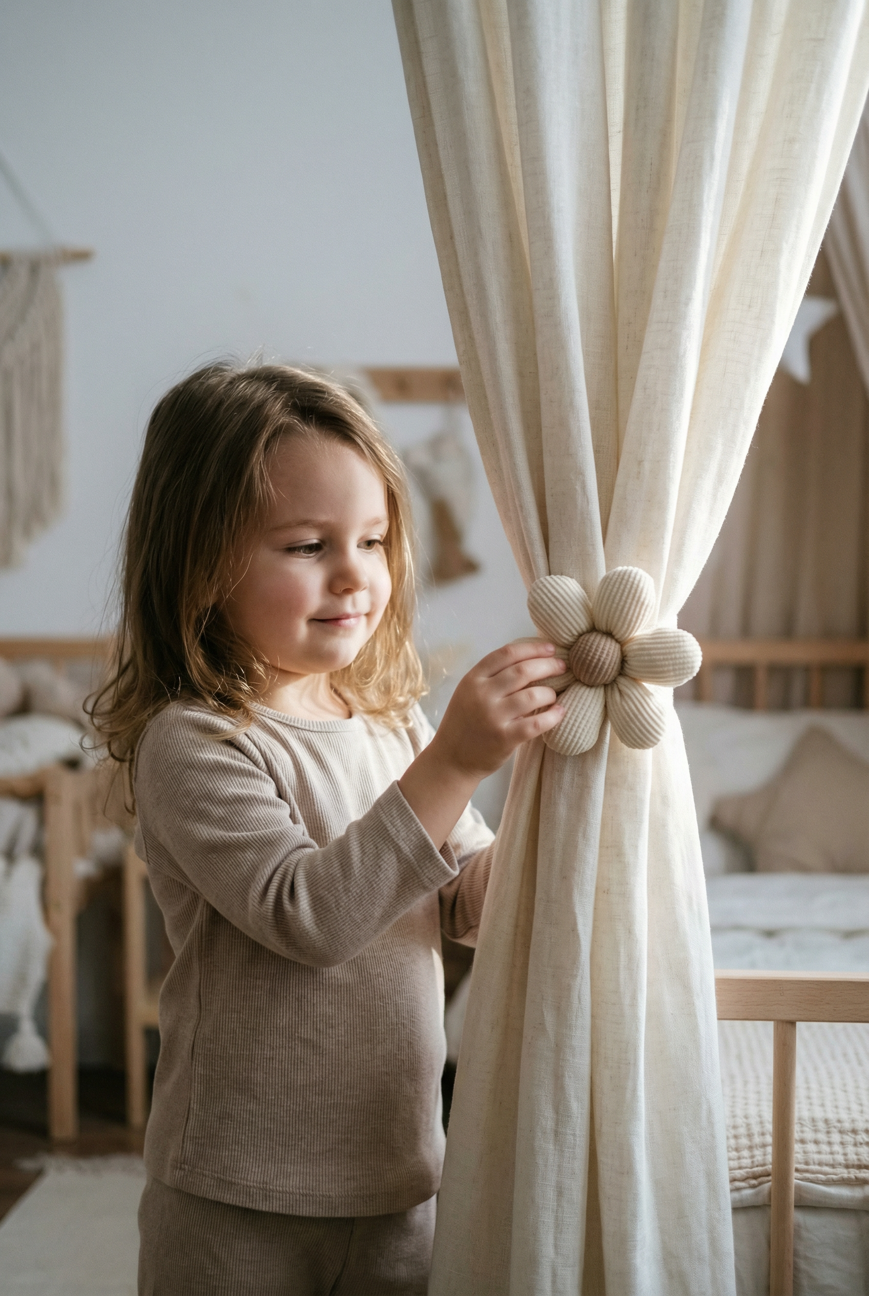 Cute flower curtain tieback that adds charm to nurseries and bedrooms. Soft rope feel, easy to loop and secure. Color Beige flowers.