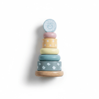 A wooden stacking tower featuring pastel-coloured rings and a rounded top piece. The smooth, easy-to-grip rings stack onto a solid wooden base, supporting coordination, size sequencing and early motor development. Soft printed details and gently rounded edges make it a calm and inviting Montessori-inspired play piece.