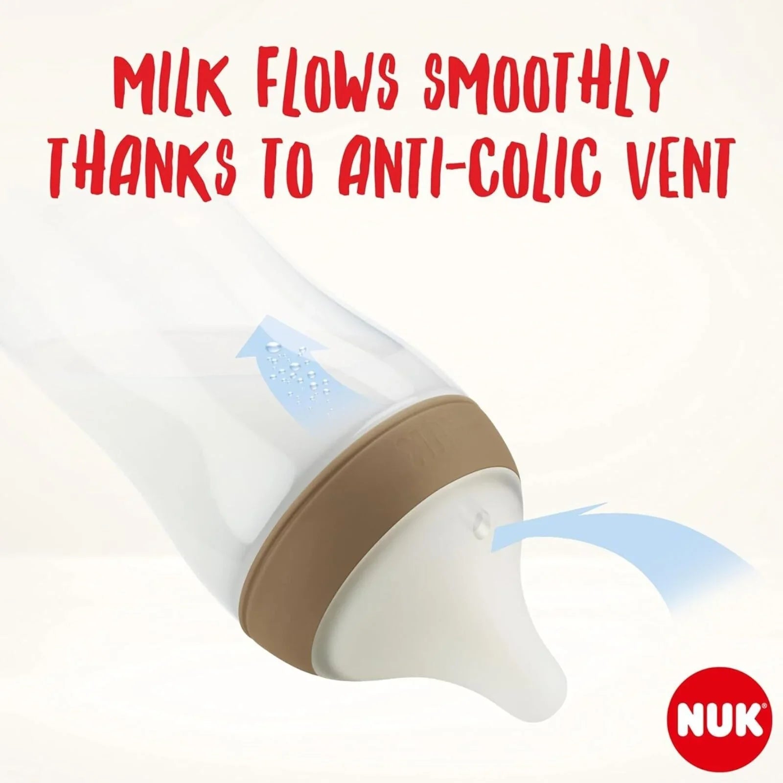 Elevate your baby’s feeding experience with the NUK Anti-Colic Perfect Match Starter Set, combining functionality and aesthetics seamlessly. Featuring an adorable and elegant design, this set is thoughtfully crafted to adapt perfectly to your baby’s needs. The soft and flexible silicone teat mimics the feel of a mother’s skin, gently moulding to your baby’s lips and palate for a natural and soothing feeding experience.