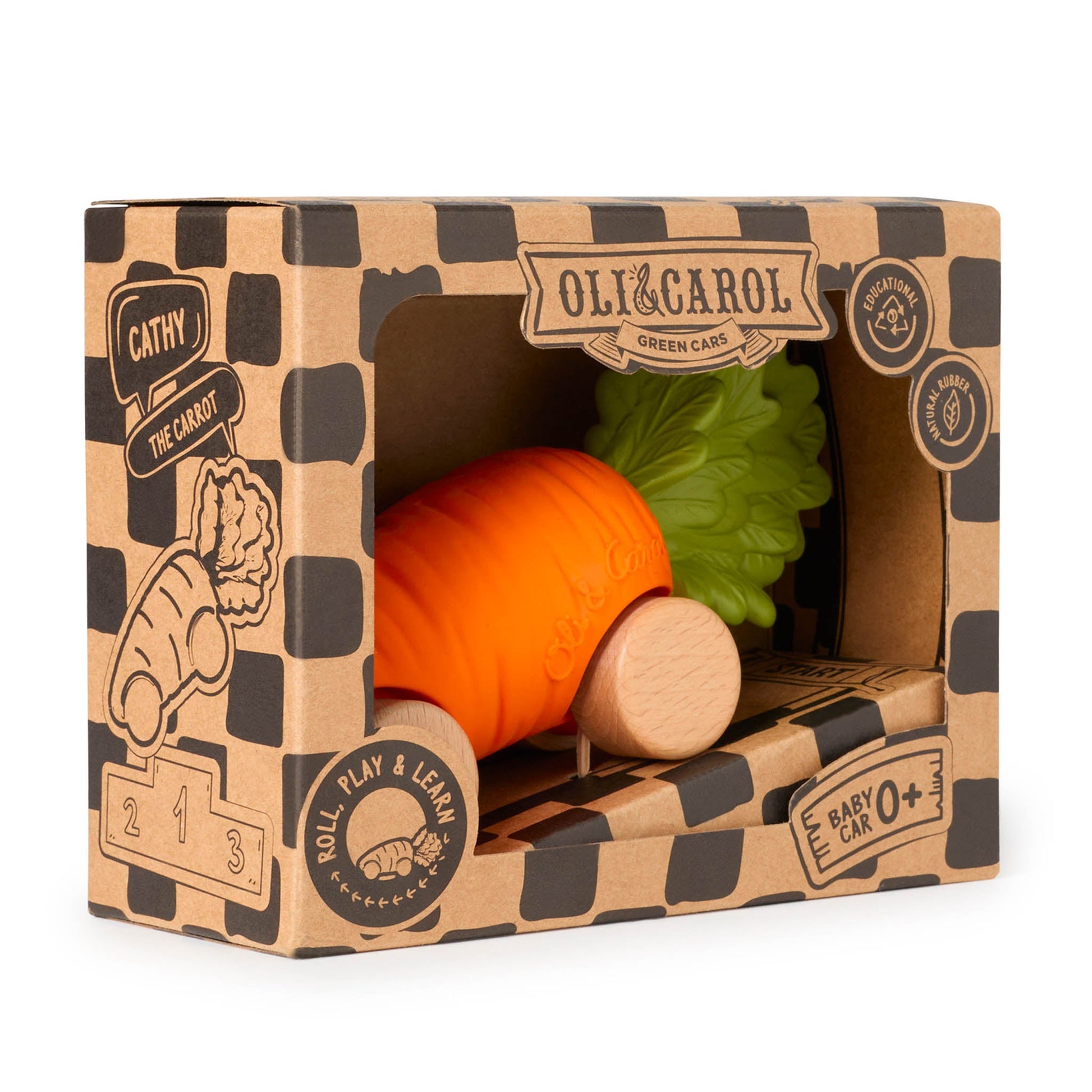 Cathy the Carrot Green Car. Chunky and easy to pick-up for small hands. Rolls super-fast on FSC wooden wheels! Rubber texture encourage child development.