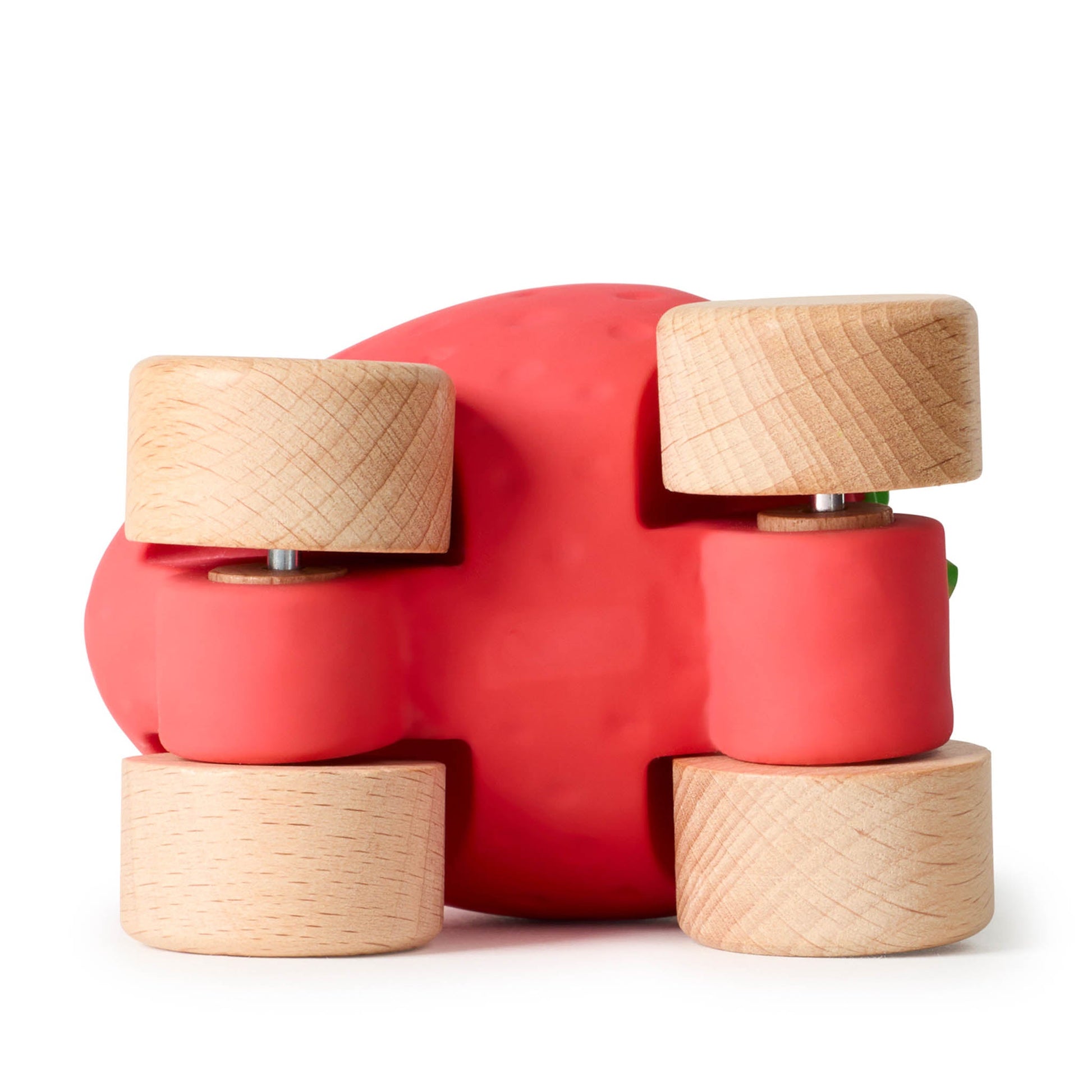 Sweetie the Strawberry Green Car. Chunky and easy to pick-up for small hands. Rolls super-fast on FSC wooden wheels! Rubber texture encourage child development.