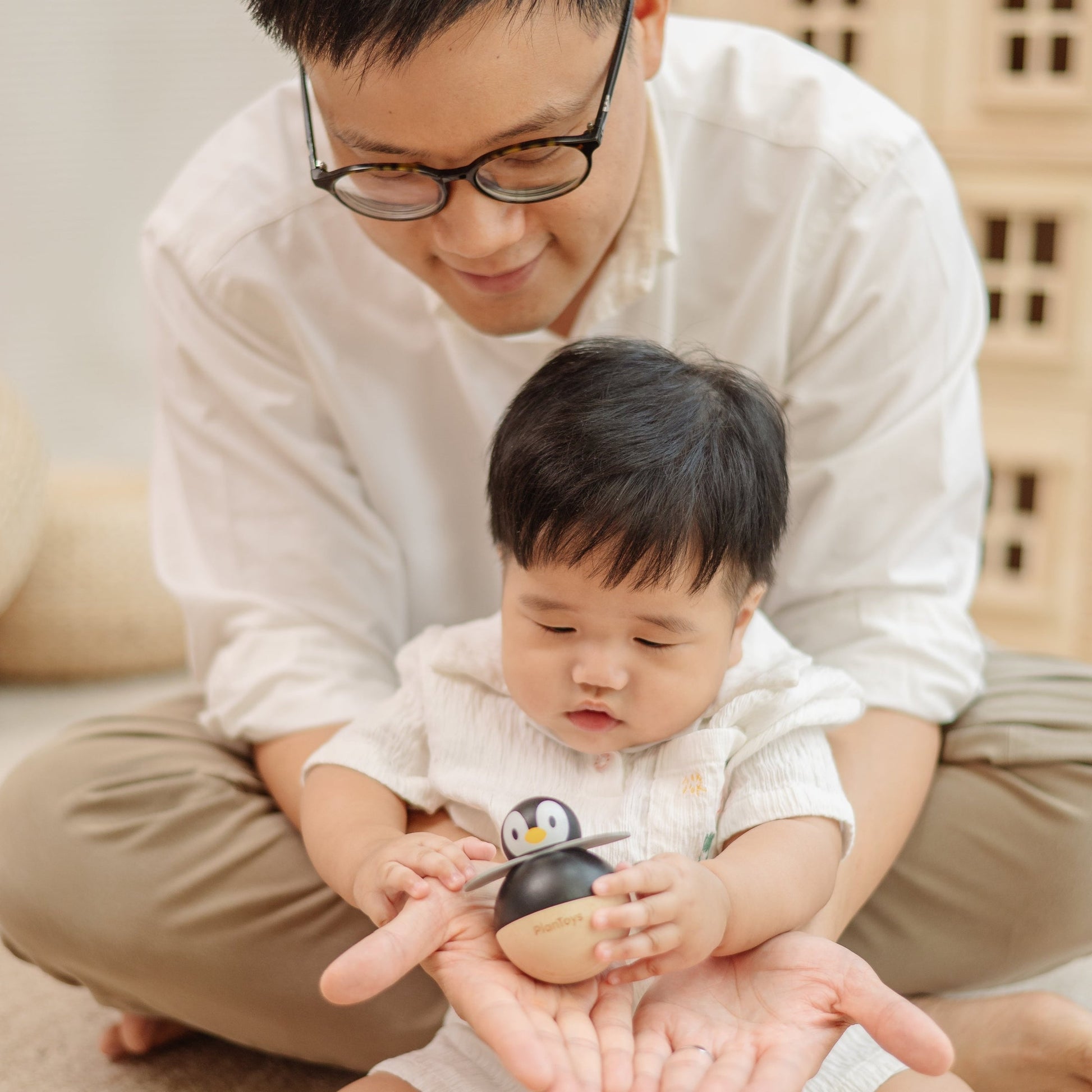 Wobble, giggle, grow! The PlanToys Penguin Wobbler keeps babies happily engaged from day one. Its gentle rocking motion captures newborns’ attention, supports tummy-time strength, and encourages reaching, pushing, and exploring. By 5–6 months, little ones discover cause and effect while building key motor skills for crawling—and beyond. Sustainably made and endlessly fun, it’s the perfect first playmate.