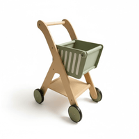 A beautifully crafted wooden shopping cart designed for pretend play, early role-play shopping, and imaginative home setups. Made from smooth natural wood with a sage-green basket, this cart features four sturdy wheels, an easy-grip handle, and a spacious lower shelf for extra groceries or toys.
