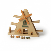 A beautifully crafted wooden windmill-themed ramp racer featuring a natural A-frame design and smooth cascading tracks. This charming play piece includes four mini wooden cars in muted earthy tones, each designed to glide down the ramps for simple, engaging play.